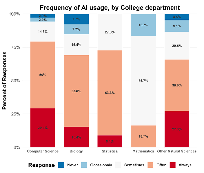 Computer Science and Biology students show the highest proportions of “Often” and “Always” usage, while Mathematics remains the most skeptical.