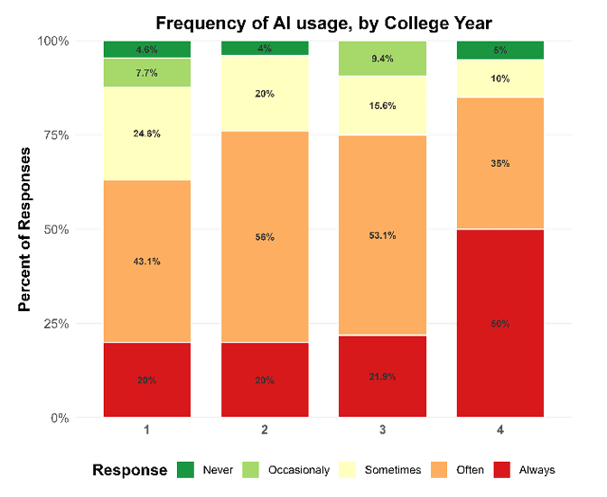 You can see a slight trend here. Notice how the red and orange shades cluster on the right for Year 4—upper‑class students lean into AI far more heavily than first‑years do.